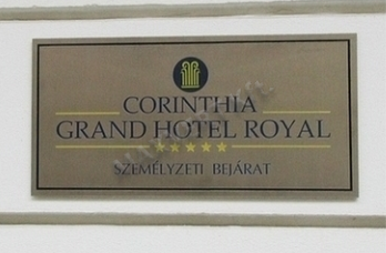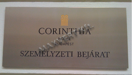 A főbejárat sárgarézől készült felirata a forgóajtó felett, a szállodalánc "standard"-ja alapján készült
